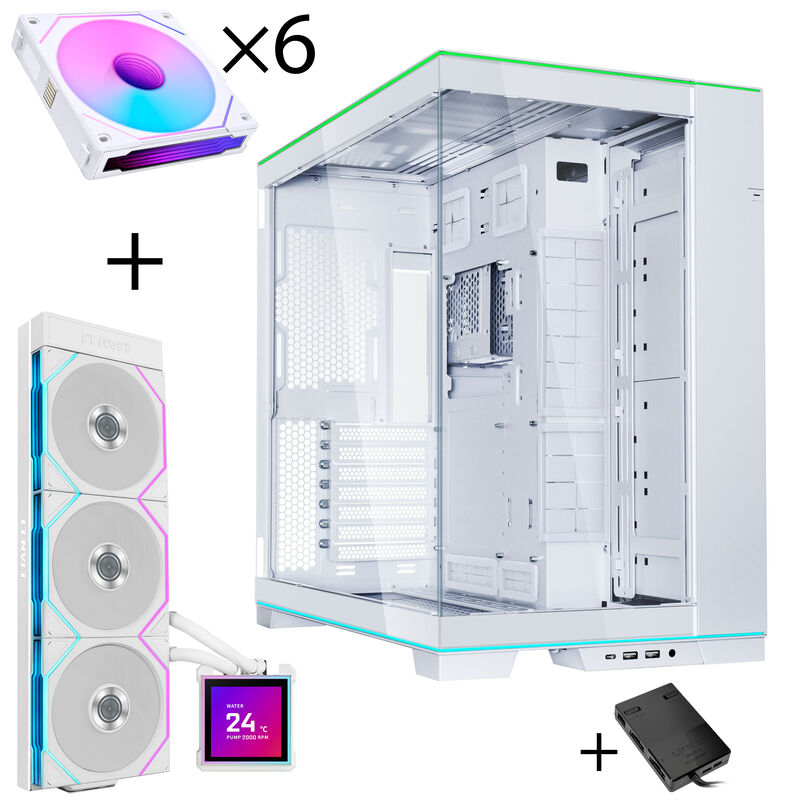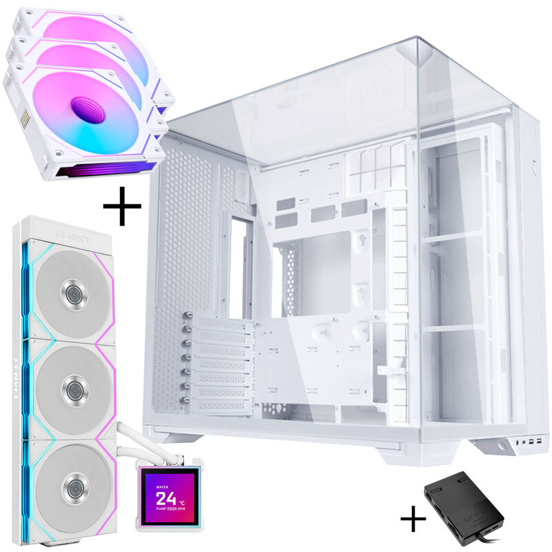 Lian Li O11 Dynamic EVO RGB PC-Gehäuse Bundle + HydroShift II LCD-S 360TL AiO + 6x UNI FAN SL-INF 120 Reverse Blade Lüfter – weiß