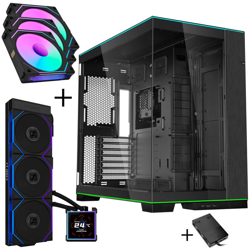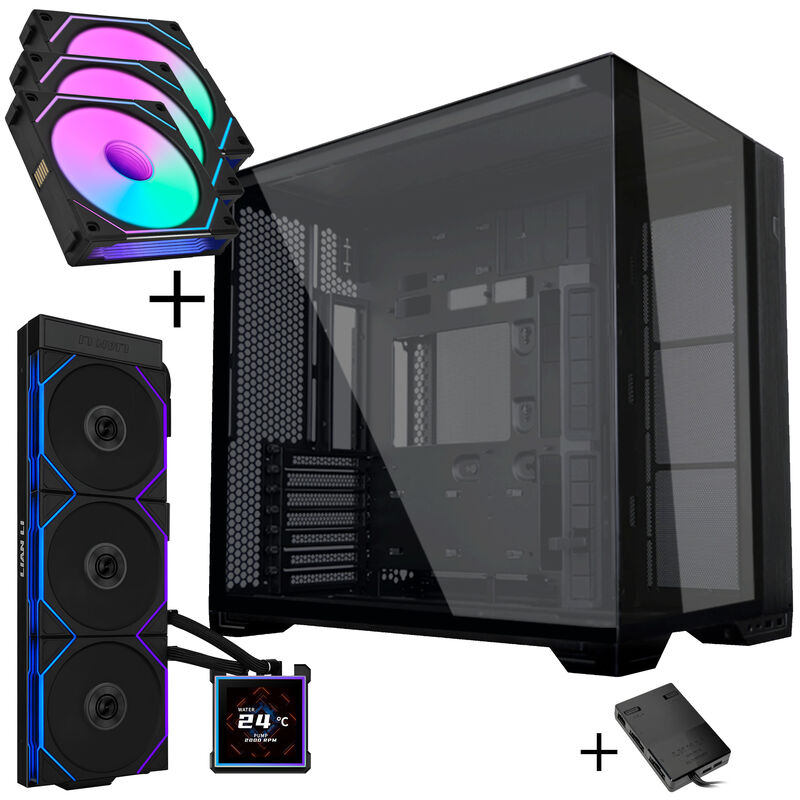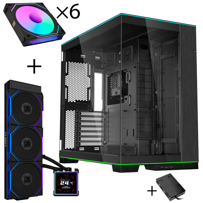 Lian Li O11D EVO RGB PC-Gehäuse Bundle + HydroShift II LCD-S 360TL AiO + 6x UNI FAN SL-INF 120 Reverse Blade Lüfter + UNI HUB SL-INF – schwarz